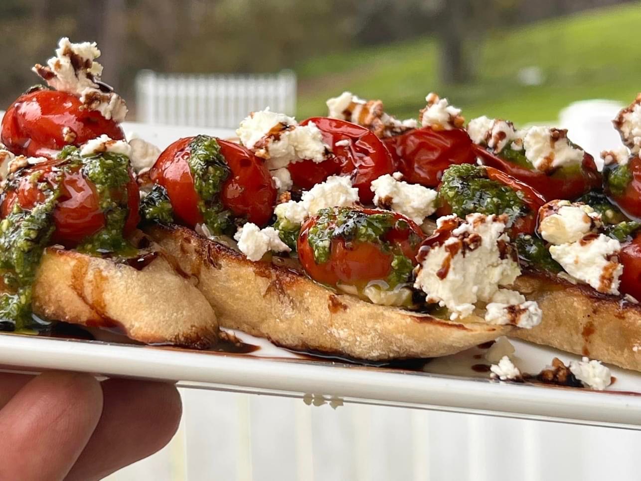Goat Cheese, Roasted Garlic & Shallot Spread with Confit Cherry Tomatoes, topped with Pesto and Balsamic Glaze